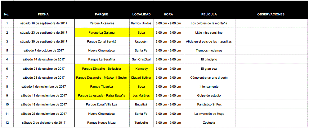 La primera temporada de Pelis por Bogotá, que comienza el 16 de septiembre, llevará a los barrios de la ciudad 12 películas, que se proyectarán en parques públicos y programará ciclos especiales en bibliotecas a través del circuito Biblored.
