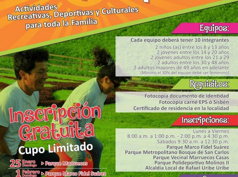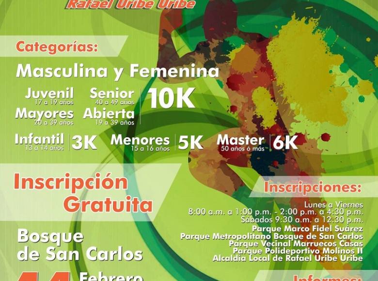 Adicionalmente, el sábado 14 de febrero se realizará en el Bosque de San Carlos la tradicional 'Lunada Atlética' en todas las categorías. Las inscripciones en ambos casos son totalmente gratis y se realizarán de lunes a sábado en los parques de Marco Fidel Suárez, Bosques de San Carlos, Marruecos Casas, Molinos II y en la Alcaldía Local de Rafael Uribe (calle 32 No. 23 - 62 sur, barrio Quiroga). Para ampliar esta información están disponibles las líneas: celular 301 441 75 63, teléfono fijo en Bogotá 284 73 04 de la organización Funactiva o en www.rafaeluribe.gov.coPara participar se deben organizar equipos de 10 integrantes en los que deben incluirse niños, adolescentes, jóvenes, adultos y adultos mayores, además por lo menos el 30 por ciento del equipo debe ser conformado por mujeres.