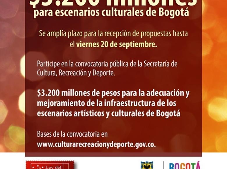 Mediante convocatoria pública la Secretaría de Cultura, Recreación y Deporte invertirá 3.200 millones de pesos para la adecuación y mejoramiento de la infraestructura de los escenarios artísticos y culturales en las localidades de Bogotá.