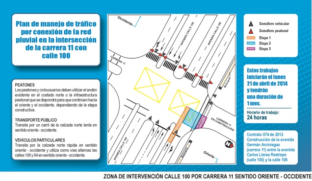 Para facilitar las obras la Secretaría Distrital de Movilidad, autorizó el cierre de un carril de la calle 100 en sentido oriente – occidente en el cruce con la carrera 11. La medida se aplicará de manera sucesiva, es decir, carril a carril hasta culminar la intervención.