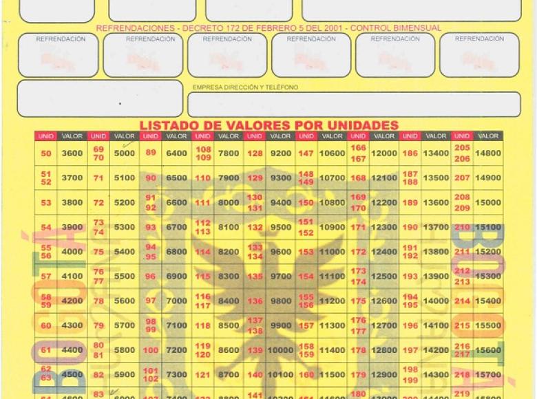 Tamaño oficio, fondo amarillo, logo de la empresa en la parte superior derecha, numero consecutivo de control, foto del conductor, datos de la empresa a la cual se encuentra afiliado el vehículo, sellos de refrendación bimensual por parte de la empresa, datos del conductor, número de placa, número de orden, código de barras, listado de valores por unidades y el cuadro de recargos autorizados.
