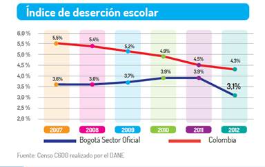 Gracias al compromiso por mejorar la calidad de la educación en Bogotá, con estrategias como el Currículo para la Excelencia y la Formación Integral 40X40 y el proyecto Educación para la Ciudadanía y la Convivencia, la ciudad logró bajar la tasa de deserción de estudiantes a 3.1 % en 2012.