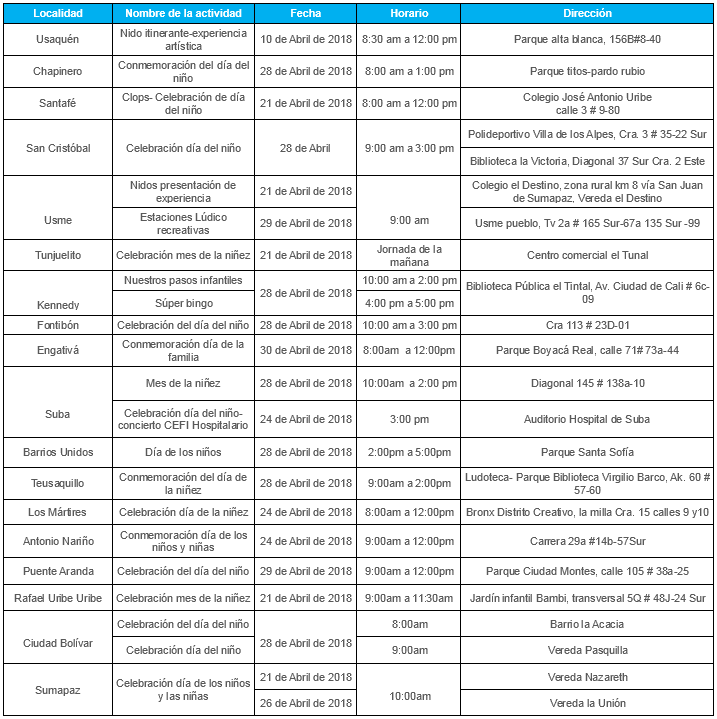 La Administración Distrital tiene preparada una agenda cultural, deportiva y recreativa que busca promocionar los derechos de los niños y niñas, así como sensibilizar sobre la importancia del ejercicio del derecho al juego y a su desarrollo integral.