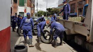 Fotos de funcionarios de la Alcaldía Local de Engativá realizando procesos de recolección de llantas.Gobierno
