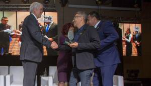 Foto que muestra al alcalde Mayor de Bogotá, Carlos Fernando Galán, junto a dos participantes durante el evento de reconocimiento a gestoresHábitat