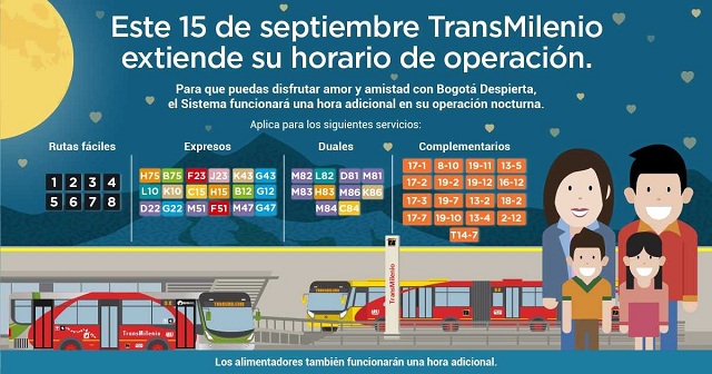 Por su parte, TransMileniotrabajará hasta las 12 de la media noche (una hora más con respecto a su horario habitual).1.500 policías vigilarán el centro de la capital en este fin de semana de Amor y Amistad. Habrá jornada de Bogotá despierta #ArribaBogotápic.twitter.com/cqv2FdzAZ7