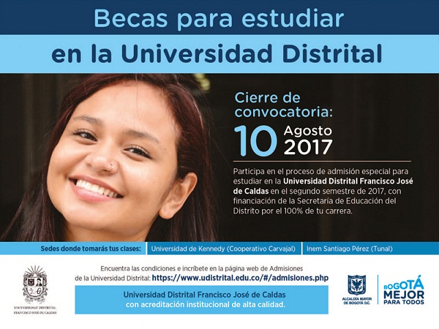 Hasta este 10 de agosto de 2017 los ciudadanos se podrán postular a la financiación del 100 por ciento de la matrícula en dos carreras tecnológicas en la Universidad Distrital, gracias a un proceso especial para jóvenes de estratos 1, 2 y 3 egresados de los colegios oficiales en los últimos los 5 años.