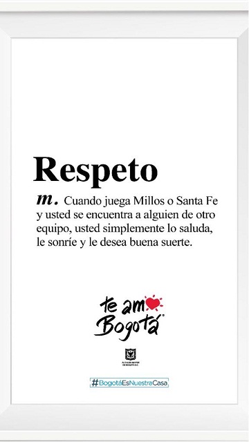 1. Respeto: cuando juega Millos o Santa Fe y usted se encuentra a alguien de otro equipo, usted simplemente lo saluda, le sonríe y le desea buena suerte.