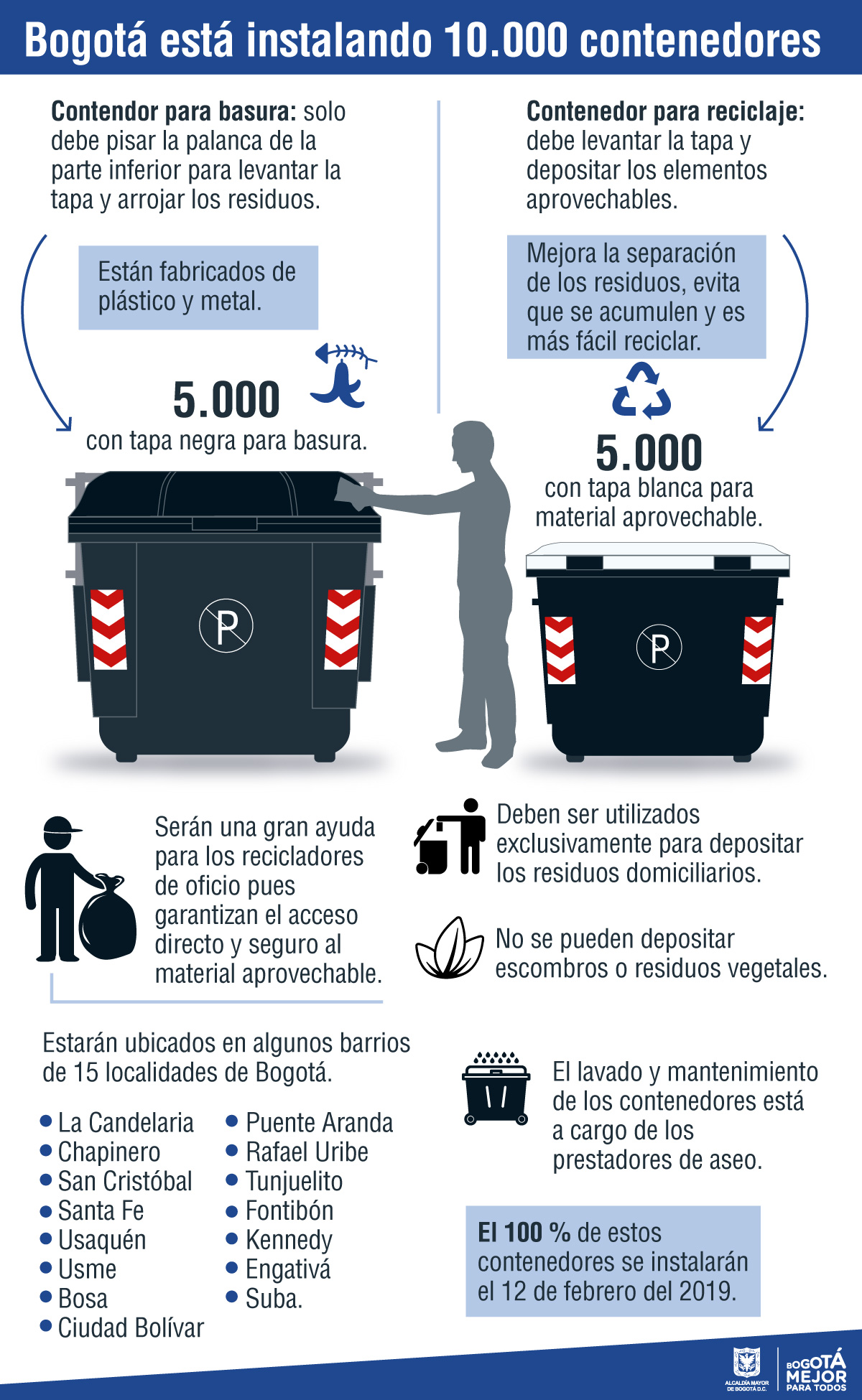 Gracias al nuevo esquema de aseo, en Bogotá se instalarán 10.000 contenedores. Unos 5.000 serán de tapa blanca para que los ciudadanos despositen el material aprovechable y los otros 5.000 de tapa negra serán para los resduos.
