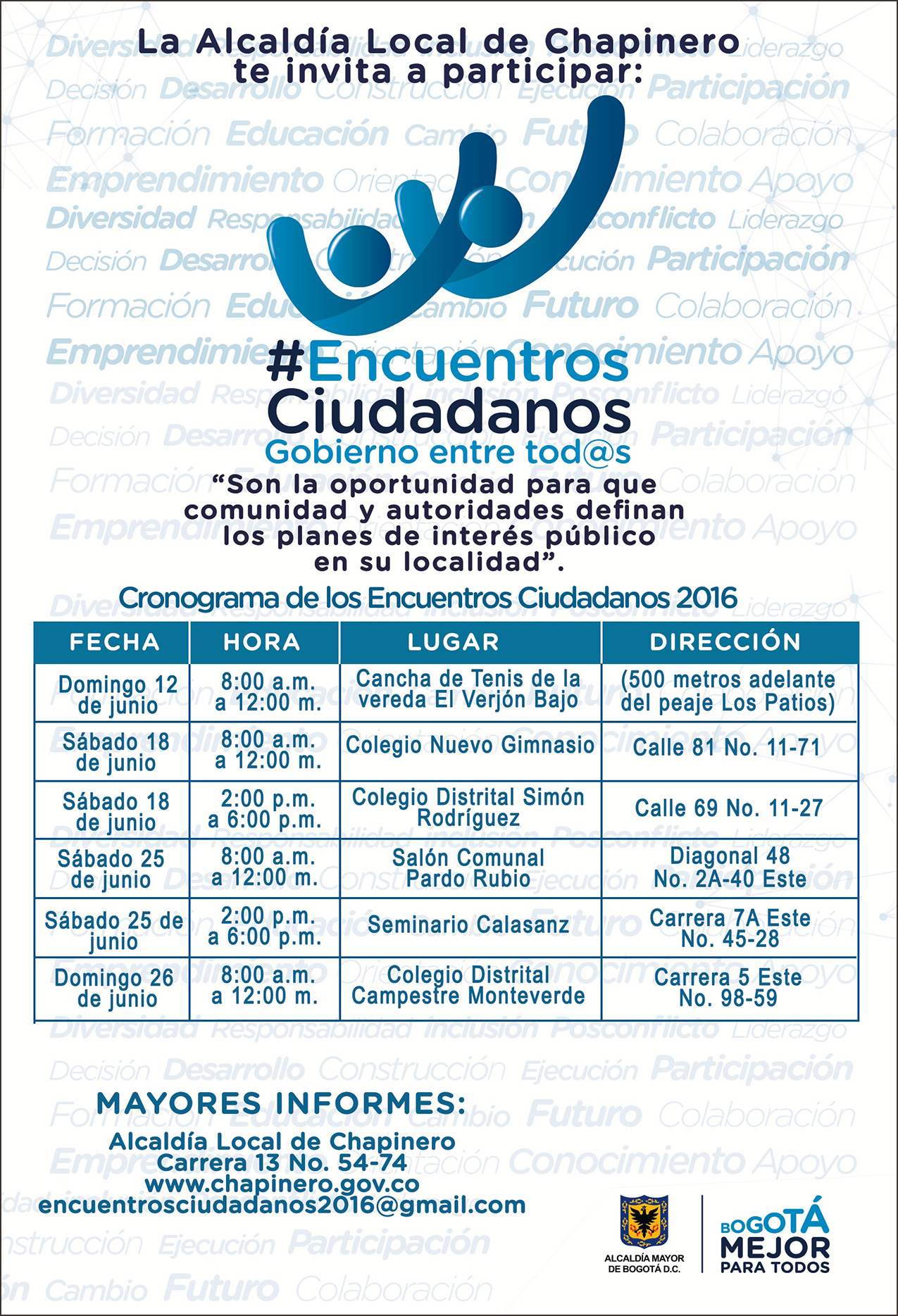 La Alcaldía Local de Chapinero y el Instituto Distrital de la Participación y Acción Comunal (IDPAC) con el apoyo del Consejo de Planeación Local (CPL), informan a los habitantes y residentes que el sábado 11 de junio, a partir de las 9:00 a.m., se realizará la instalación oficial de los Encuentros Ciudadanos de Chapinero 2016.