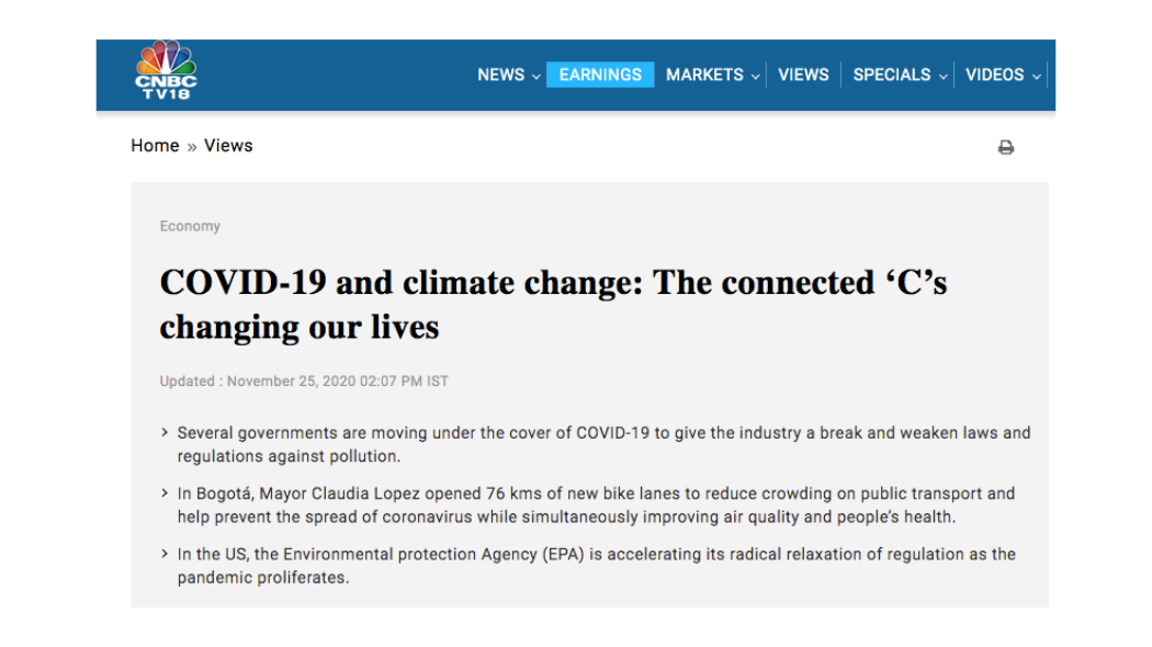 CNBC TV18 published an article that critically analyzes the way governments have faced the challenges brought about by the pandemic. While it points out some governments for using the crisis by COVID-19, as an excuse to relax laws and regulations on industrial emissions, at the same time, it positively highlights Bogotá as an example for its responsible recovery strategy.