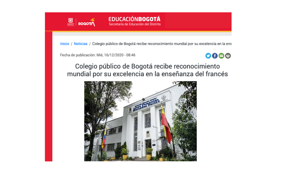This award to the Liceo Femenino Mercedes Nariño recognizes the coverage that covers more than 5000 girls and adolescents learning French; the spaces dedicated to this language; the formation of the teaching team; the official DELF exams; the organization and management of the courses; and the innumerable activities that allow the teaching of French and English for the benefit of the students.