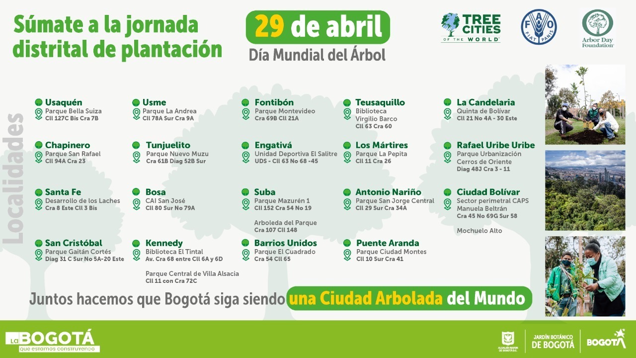 Para conmemorar este día, la Alcaldía de Bogotá realizará una jornada de plantaciones de árboles en 19 localidades de la ciudad. Toda la comunidad está invitada a ser parte de las plantaciones y así, ayudar al reverdecimiento de Bogotá.