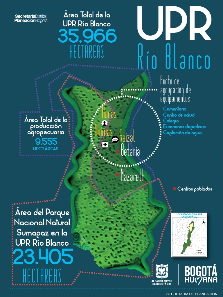 La Unidad de Planeamiento Rural de Río Blanco abarca 35.966 hectáreas. Es la segunda de mayor extensión en la ruralidad bogotana.