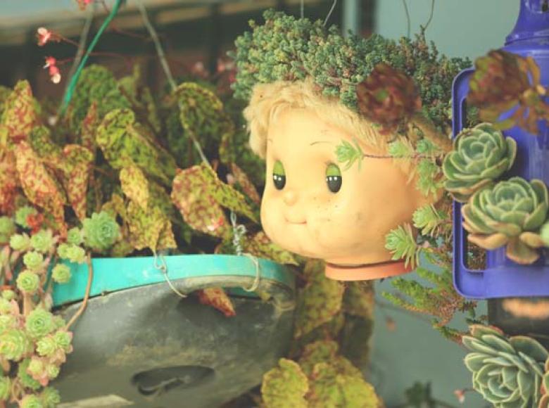 El patio del colegio está inundado de diferentes plantas que han sido sembradas en diversos elementos como cabezas de juguetes, tarros viejos y ollas, que adornan y dan vida al lugar.