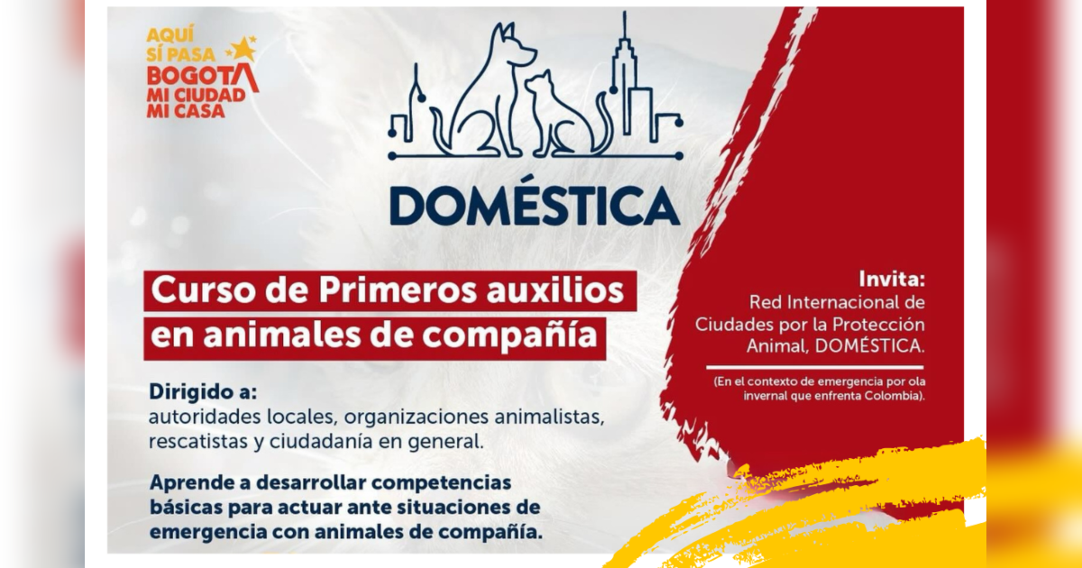 ¡En Bogotá, mi Ciudad, mi Casa nos mueve la solidaridad y el cuidado animal! La Red Internacional de Ciudades por la Protección Animal Doméstica (Red Doméstica), presidida por el Instituto Distrital de Protección y Bienestar Animal (IDPYBA) en Bogotá, lanza el curso virtual y gratis 'Primeros Auxilios para Animales de Compañía' con 40 horas de extensión, el cual contará con certificación. ¡Conoce los detalles e inscríbete!