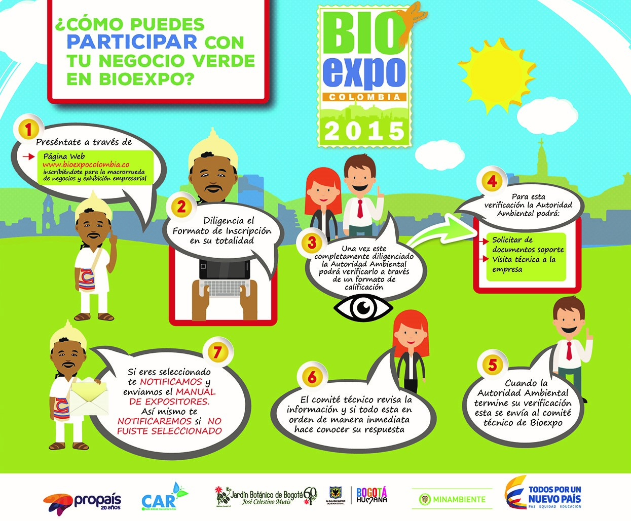 El Ministerio de Ambiente y Desarrollo Sostenible, a través de la Oficina de Negocios Verdes y Sostenibles, realizará, del 5 al 7 de noviembre de 2015, la Macro-rueda de negocios 'Bioexpo Colombia 2015', con el apoyo de la Corporación Autónoma de Cundinamarca-CAR, el Jardín Botánico de Bogotá y la Corporación para el Desarrollo de las Microempresas – Propaís. La cita será en las instalaciones del Jardín Botánico.