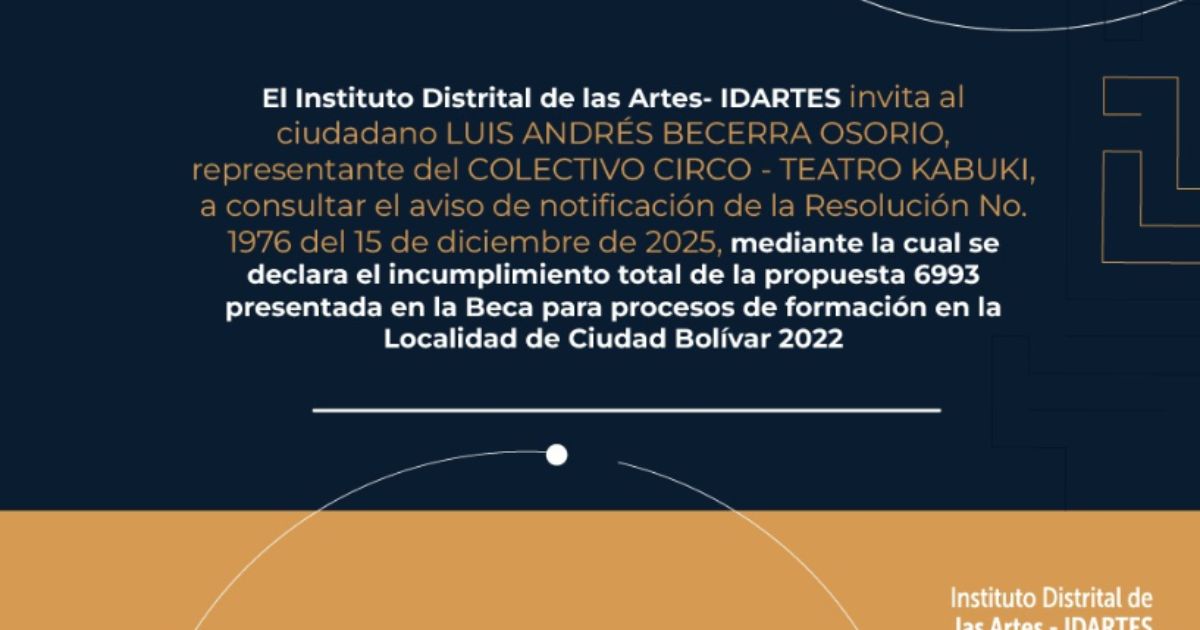 En Bogotá, mi Ciudad, mi Casa estamos comprometidos con el fomento a las culturas y el arte! El Instituto Distrital de las Artes (Idartes) invita al ciudadano Luis Andrés Becerra Osorio, representante del Colectivo Circo - Teatro Kabuki, a consultar el aviso de notificación de la Resolución No. 1976 del 15 de diciembre de 2025, mediante la cual se declara el incumplimiento total de la propuesta 6993 presentada en la ´Beca para procesos de formación en la Localidad de Ciudad Bolívar 2022´.