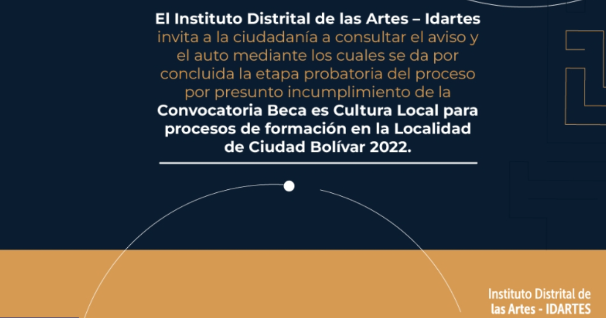 ¡En Bogotá, mi Ciudad, mi Casa estamos comprometidos con el fomento a las culturas y el arte! El Instituto Distrital de las Artes (Idartes) te informa que ya está disponible en su página web el aviso y el auto que dan por terminada la convocatoria Beca es Cultura Local para procesos de formación en la Localidad de Ciudad Bolívar 2022, con el propósito de garantizar que la ciudadanía y las personas interesadas conozcan el desarrollo de dicho proceso. Esta publicación responde al compromiso de la entidad con la transparencia y el acceso a la información pública.