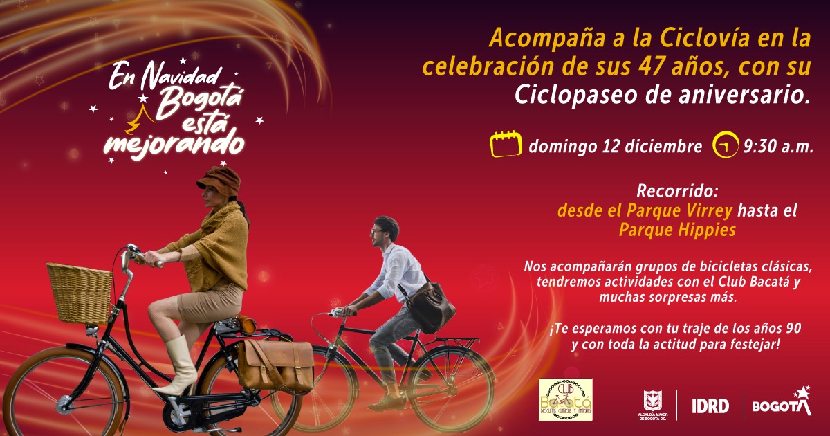 Este domingo, 12 de diciembre, Bogotá celebra el cumpleaños número 47 de la Ciclovía, y qué mejor forma de hacerlo que con un ciclopaseo, recorridos y muestras deportivas que le hacen tributo a la bicicleta y a esta tradicional actividad.