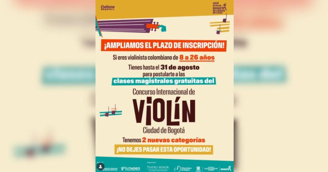 En Bogotá, mi Ciudad, mi Casa, impulsamos la cultura, el arte y la música! Por eso te informamos que, si estás interesado en tomar lecciones con algunos de los mejores violinistas del mundo, ¡Estás a tiempo! pues el Concurso Internacional de Violín Ciudad de Bogotá, amplió la fecha de inscripciones hasta el 31 de agosto de 2025. Inscríbete aquí.