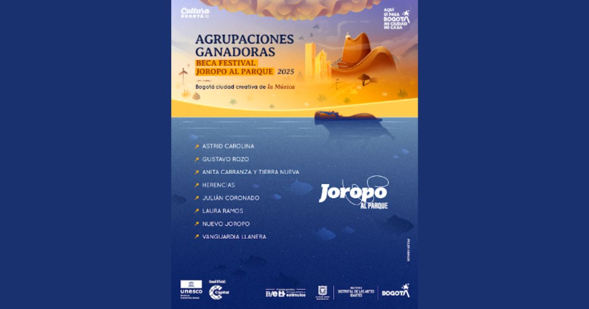 Los artistas distritales que hacen parte del cartel de agrupacicones que estarán en esta edición del Festival Joropo al Parque son ganadores de la Beca Festival Joropo al Parque 2025 y como parte de los beneficios de participar en dicha convocatoria tendrán la oportunidad de compartir escenario con grandes figuras de la música llanera nacional e internacional.