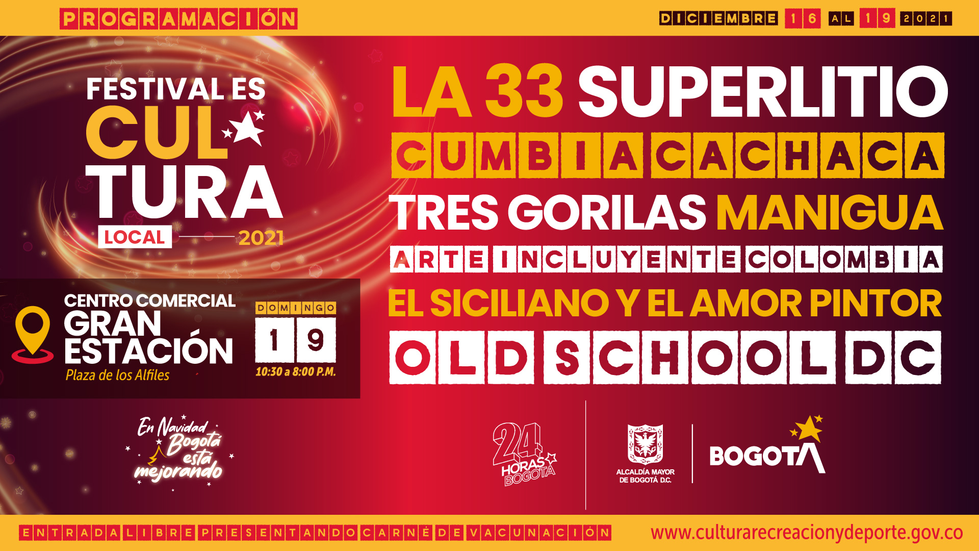 El Festival Es Cultura Local con muestras artísticas, conciertos y ofertas de productos de emprendimientos culturales y creativos, se tomó la Plaza de los Alfiles, del centro comercial Gran Estación, desde el pasado 17 de diciembre y tendrá su celebración de clausura este 19 de diciembre, con el show de la orquesta La 33.