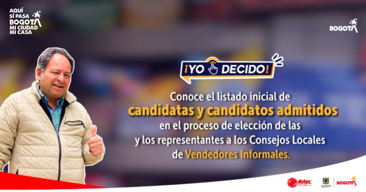 ¡En Bogotá, mi Ciudad, mi Casa fortalecemos los mecanismos de participación ciudadana! El Instituto para la Economía Social (IPES) ya publicó el listado inicial de admitidos como candidatas, candidatos y votantes en el proceso electoral de los Consejos Locales y el Consejo Distrital de Vendedores Informales, en cumplimiento del cronograma establecido en la Resolución 536 del 2025, para esta jornada democrática en 2026. ¡Revisa todos los detalles!