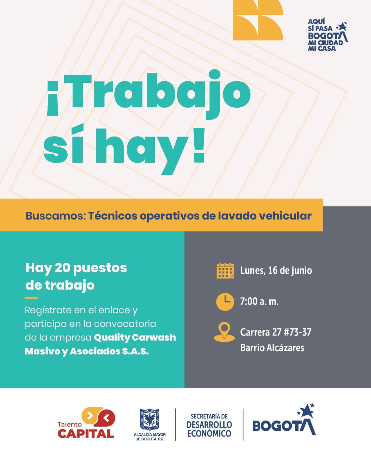 ¡Trabajo sí hay en ‘Bogotá, mi Ciudad, mi Casa’!Accede a 20 vacantes laborales con ‘Talento Capital’ para técnicos operativos de lavado de vehículos. Asiste este lunes 16 de junio de 2025, a la Feria de Empleo con Agencia Distrital de Empleo de Bogotá en el barrio Alcázares en la localidad de Barrios Unidos. Lleva tu hoja de vida actualiza. ¡Conoce los detalles aquí, asiste y postúlate!