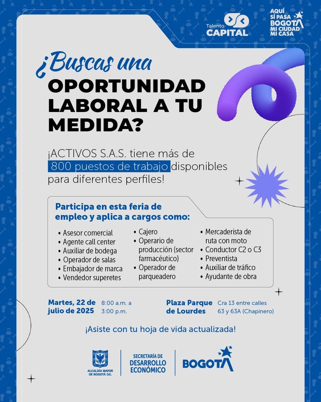 ¡En ‘Bogotá, mi Ciudad, mi Casa’ trabajo sí hay! ¿Estás buscando empleo? Accede a 800 vacantes laborales que trae ‘Talento Capital’ este martes 11 de julio de 2025 en la Mega Feria de Empleo en la Plaza Parque Lourdes, ubicada en la localidad de Chapinero en el norte de Bogotá. Hay cargos disponibles para asesor comercial, agente call center, auxiliar de bodega, operador de salas, embajador de marca, cajero, mercaderista, operario de producción y muchos más. ¡Conoce aquí los detalles, asiste y postúlate de manera presencial!