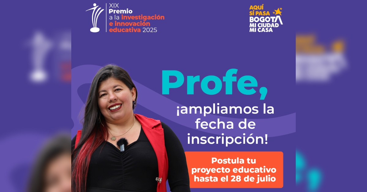 ¡Aquí sí pasa, en Bogotá, mi Ciudad, mi Casa impulsamos la investigación en la educación! La Secretaría de Educación del Distrito (SED) y el Instituto Distrital para la Investigación Educativa y el Desarrollo Pedagógico (IDEP), extienden la fecha para la recepción de propuestas a la XIX versión del Premio a la Investigación e Innovación Educativa 2025, una iniciativa de ciudad que reconoce a docentes, docentes orientadores (as) y directivos (as) docentes de planta, que han desarrollado proyectos de investigación o innovación en las instituciones educativas públicas de Bogotá.