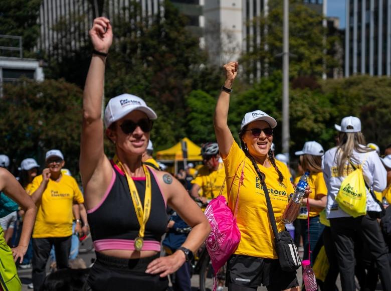 Deportistas profesionales y aficionados, jóvenes, adultos mayores y familias enteras con sus mascotas participaron en la actividad que se convirtió en una inmensa mancha amarilla que se desplazó por distintas rutas de la Ciclovía de Bogotá, mostrando su respaldo a la estrategia Paz Electoral, que tiene como objetivo que las elecciones se hagan en paz y que las mismas sean libres, seguras, conscientes, oportunas, transparentes y cuyos resultados sean respetados.