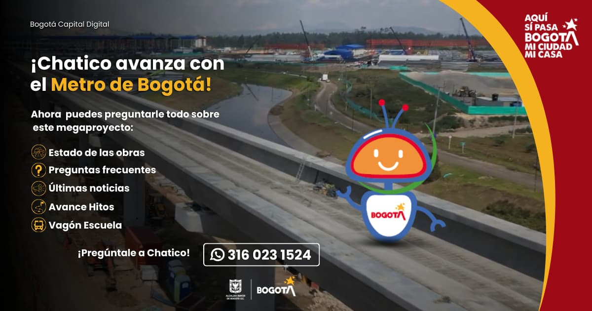 ¡Aquí sí pasa! Gracias al trabajo de la Consejería Distrital de TIC y la Empresa Metro de Bogotá, ahora puedes consultar en línea la información clave sobre el avance y funcionamiento de la línea 1 del Metro de Bogotá a través de Chatico, el agente virtual de ‘Bogotá, mi Ciudad, mi Casa’, sin importar el día ni la hora.