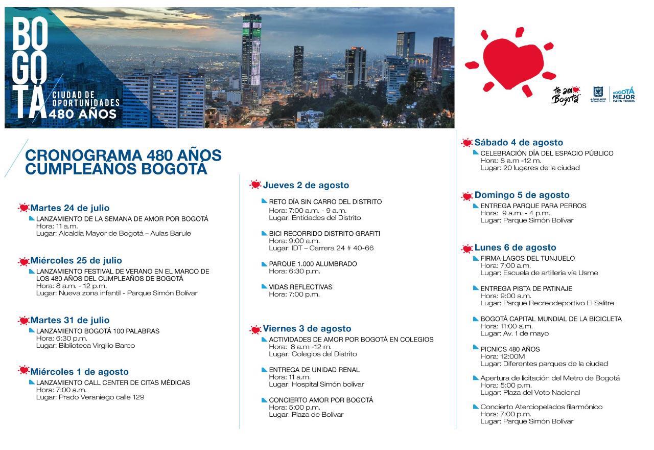 Toda esta conmemoración especial se enmarca en ‘La semana del amor por Bogotá’, que comienza el 24 de julio y que incluye una agenda especial para entregarle muchos ‘regalos’ a la ciudad en sectores como espacio público, salud, seguridad vial, vivienda, deporte y avances en la consolidación de la primera línea del Metro, entre muchos otros eventos.