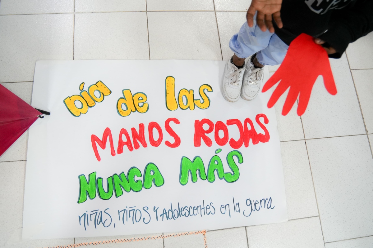 Además, en el Palacio Liévano se llevó a cabo una activación simbólica con sensibilización a funcionarios, quienes fueron invitados a pegar una mano roja como símbolo de compromiso con la prevención del reclutamiento infantil.