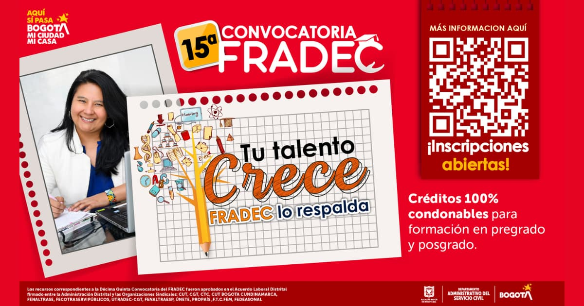 El Departamento Administrativo del Servicio Civil Distrital (DASCD) recuerda al talento humano de las entidades públicas de Bogotá, mi Ciudad, mi Casa, que hasta el 7 de julio de 2025 estarán abiertas las inscripciones de la décima quinta convocatoria del Fondo Educativo en Administración de Recursos para Capacitación Educativa de los Empleados Públicos del Distrito Capital (FRADEC), que otorga créditos educativos 100% condonables.