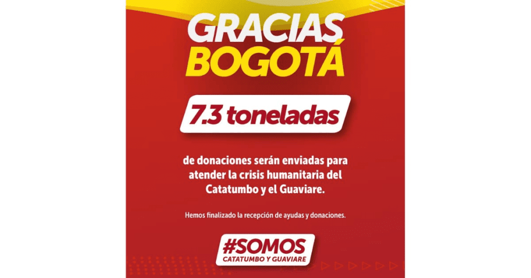 Estas ayudas fueron recogidas en la Donatón #SomosCatatumboYGuaviare, iniciativa de la Alcaldía Mayor de Bogotá, que contó con el liderazgo de la Consejería Distrital de Paz, Víctimas y Reconciliación, en articulación con la Secretaría Distrital de Gobierno (SDG) y la Sociedad Nacional de la Cruz Roja Colombiana.