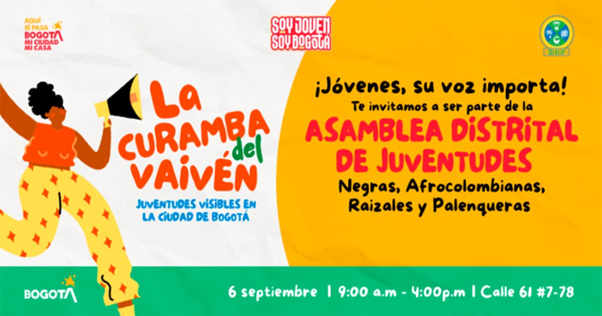 ¡Aquí sí pasa! En Bogotá, mi Ciudad, mi Casa incentivamos la participación de las juventudes. Es por esto que la Alcaldía Mayor de Carlos Fernando Galán, junto con el Consejo Distrital de Juventudes de las comunidades Negras, Afrocolombianas, Raizales y Palenqueras, invita a la ciudadanía a participar en la Asamblea Distrital de Juventudes y en la jornada “La Curamba del Vaivén: Juventudes Visibles en la ciudad de Bogotá”.