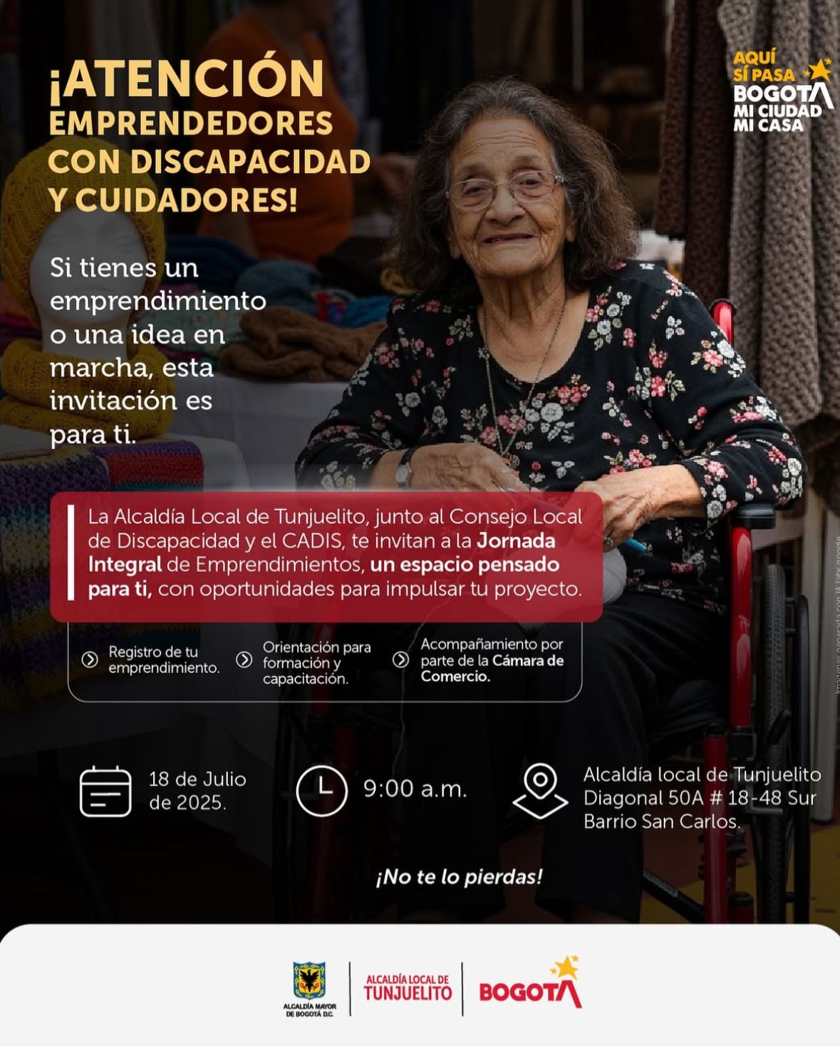 ¡Aquí sí pasa en ‘Bogotá, mi Ciudad, mi Casa’ apoyamos a los emprendedores locales con presencia en los grandes eventos! Con el firme propósito de seguir fortaleciendo la inclusión social y económica en la localidad, la Alcaldía Local de Tunjuelito, en articulación con el Consejo Local de Discapacidad y el CADIS, realizará este viernes 18 de julio de 2025 una Jornada Integral de Emprendimientos, un espacio creado especialmente para personas con discapacidad y sus cuidadores que tienen un emprendimiento o una idea de negocio en marcha.