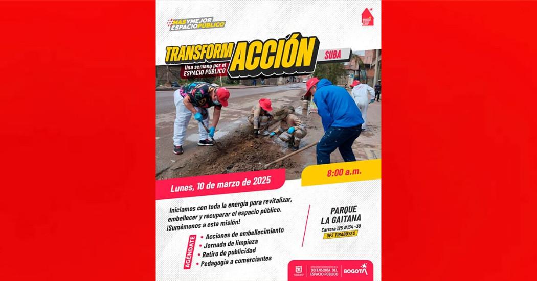 En ‘Bogotá, mi Ciudad, mi Casa’ trabajamos por la recuperación y embellecimiento del espacio público. La 'TransformAcción' llega a Suba con planes de limpieza, embellecimiento, pedagogía y mucho más, para renovar espacios públicos claves de las 10 UPZ de la localidad. Se trata de un cronograma de intervenciones que se ejecutarán por cinco días consecutivos, en donde la participación de la ciudadanía será fundamental para lograr cambios duraderos en el tiempo. El trabajo de al menos 40 defensores será entregar renovados parques, plazas, entre otros escenarios, renovados y listos para el disfrute de las comunidades.