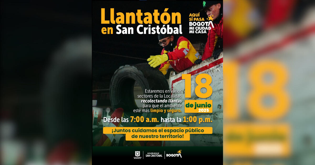 ¡En Bogotá, mi Ciudad, mi Casa seguimos recuperando el espacio público de nuestras localidades! La Alcaldía Local de San Cristóbal, hace un llamado a la participación activa de todos los residentes de la localidad. Para ello, se invita a la ciudadanía a que saque sus llantas usadas en los puntos establecidos durante el horario previsto para la recolección. Esta es una oportunidad para unirnos como comunidad y demostrar que, con pequeñas acciones colectivas, podemos lograr grandes cambios.