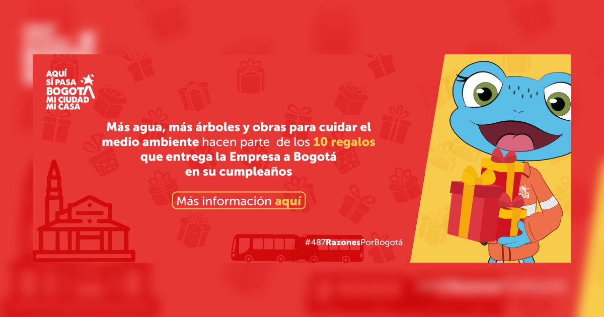 ¡Celebramos los 487 años de Bogotá, mi Ciudad, mi Casa! En este día, la Empresa de Acueducto y Alcantarillado de Bogotá (EAAB) le entrega diez regalos a la capital que contribuyen con la calidad de vida y el bienestar de la ciudadanía.