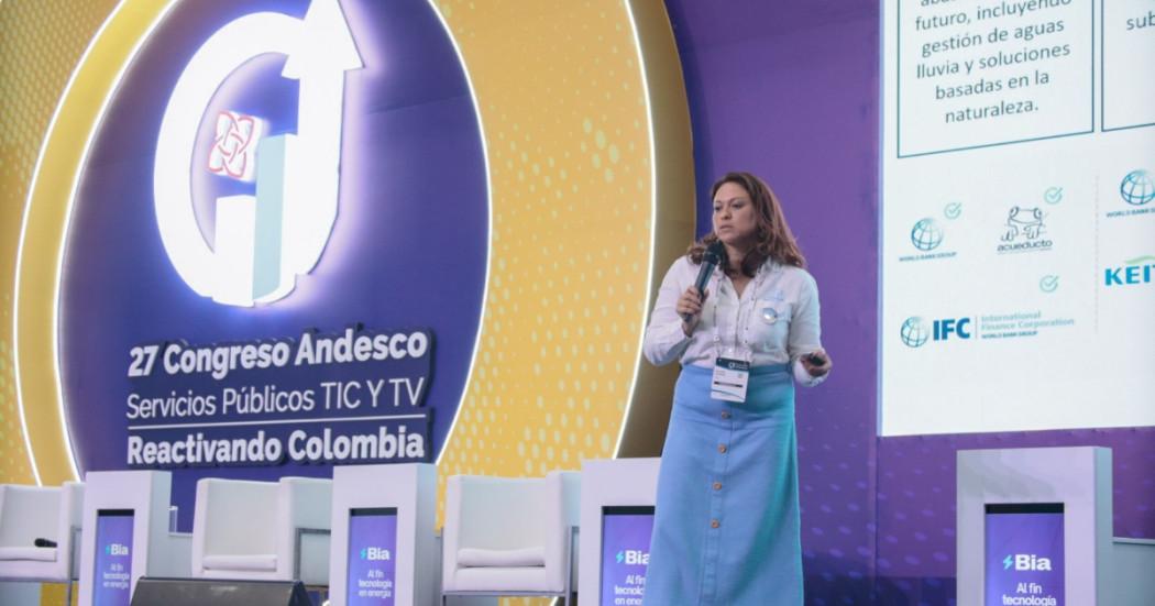 La gerente general de la Empresa de Acueducto y Alcantarillado de Bogotá (EAAB), Natasha Avendaño, y Alexander Serrano, experto del Banco Mundial, presentaron durante la versión 27 del Congreso de Andesco, la Estrategia de Seguridad Hídrica de Bogotá, que evitará situaciones como las vividas en el 2024 producto del año más seco en el Sistema Chingaza.