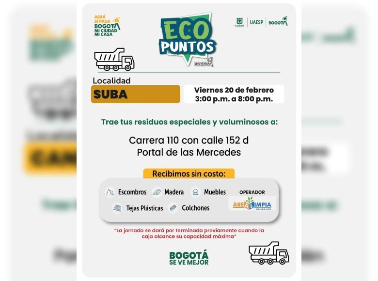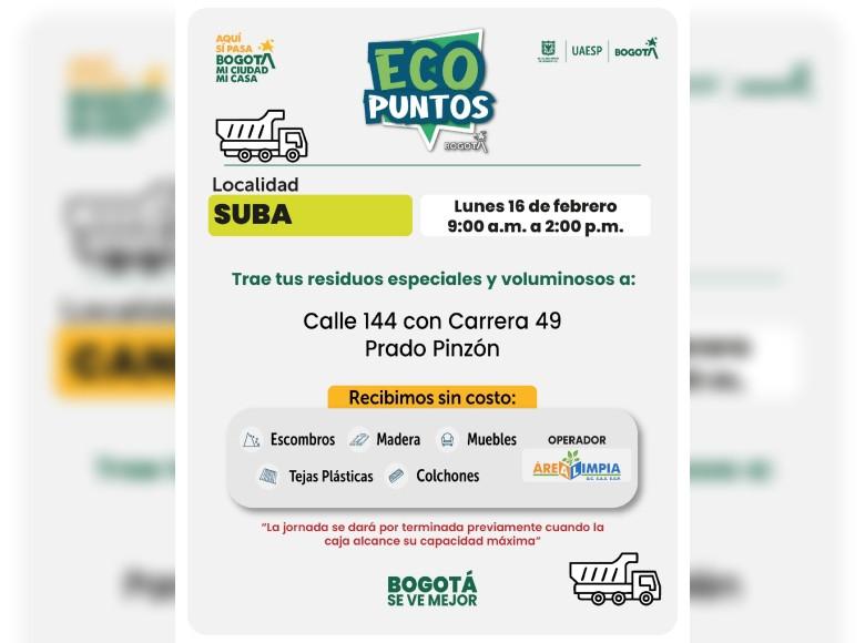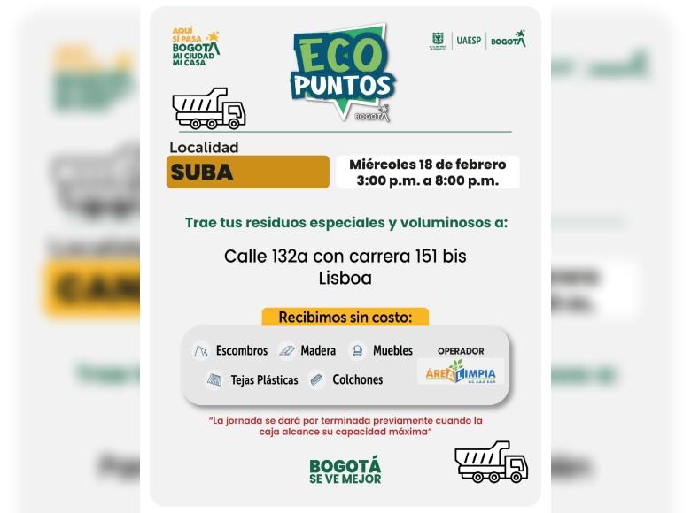 ¡Aquí sí pasa, en Bogotá, mi Ciudad, mi Casa trabajamos para mantener limpia nuestra ciudad! La Unidad Administrativa Especial de Servicios Públicos (UAESP) invita a la ciudadanía que tenga muebles, escombros o enseres en mal estado a llevarlos a los Ecopuntos disponibles en Bogotá que se tendrán ubicados en Suba, Barrios Unidos y más localidades, del 16 al 21 de febrero del 2026.