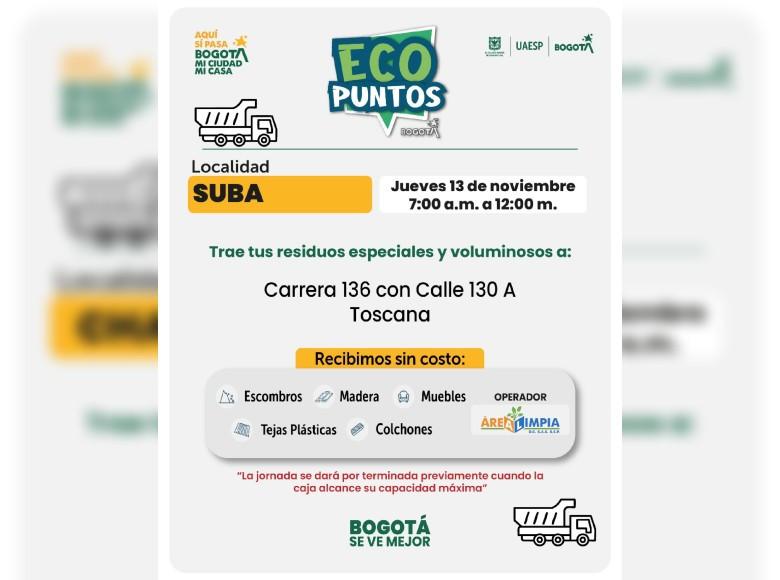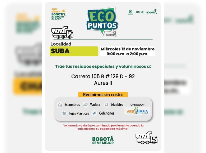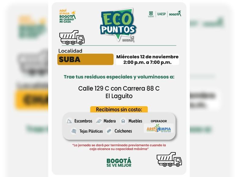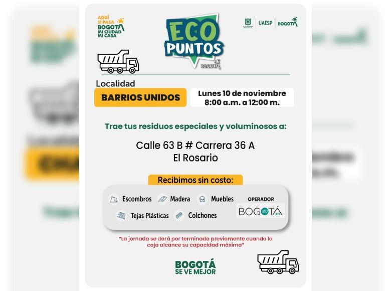 ¡Aquí sí pasa, en Bogotá, mi Ciudad, mi Casa trabajamos para mantener limpia nuestra ciudad! La Unidad Administrativa Especial de Servicios Públicos (UAESP) invita a la ciudadanía que tenga muebles, escombros o enseres en mal estado a llevarlos a los Ecopuntos disponibles en Bogotá que se tendrán ubicados en Usaquén, Antonio Nariño, Barrios Unidos y más localidades, del 10 al 14 de noviembre de 2025.