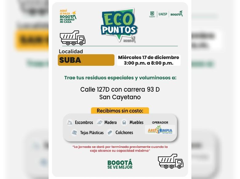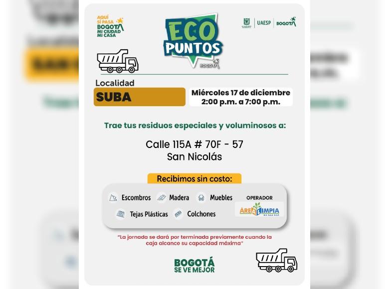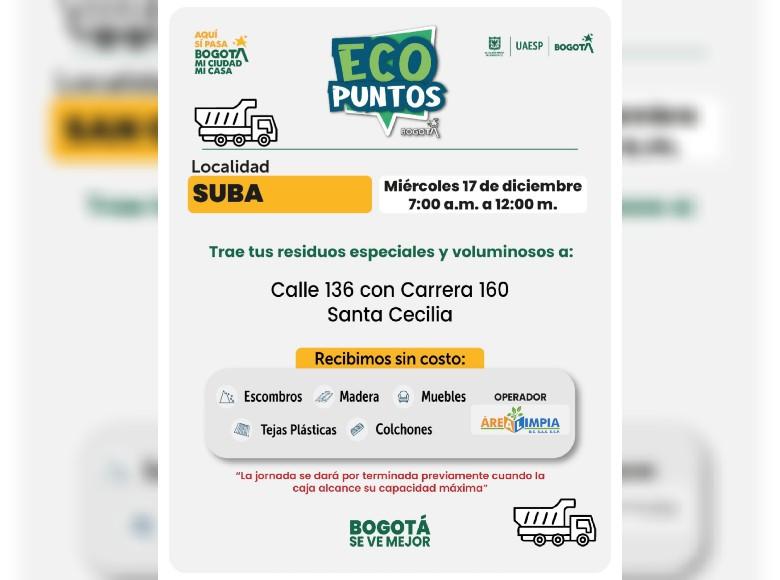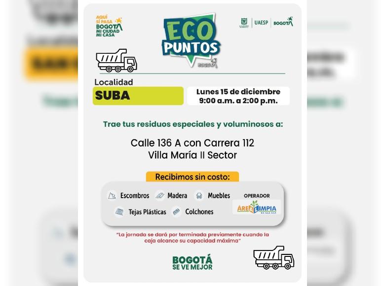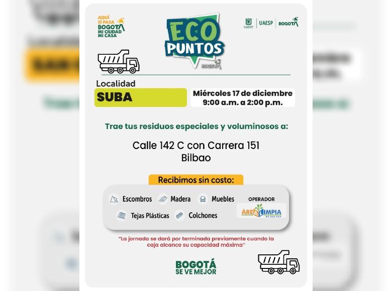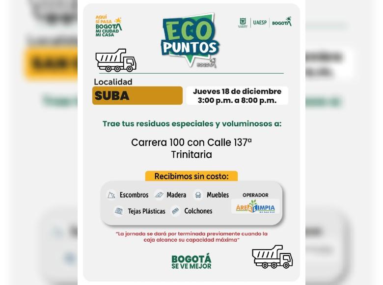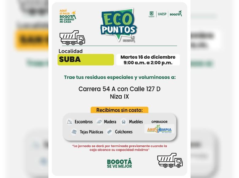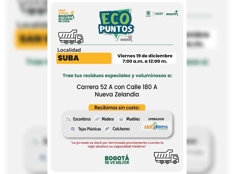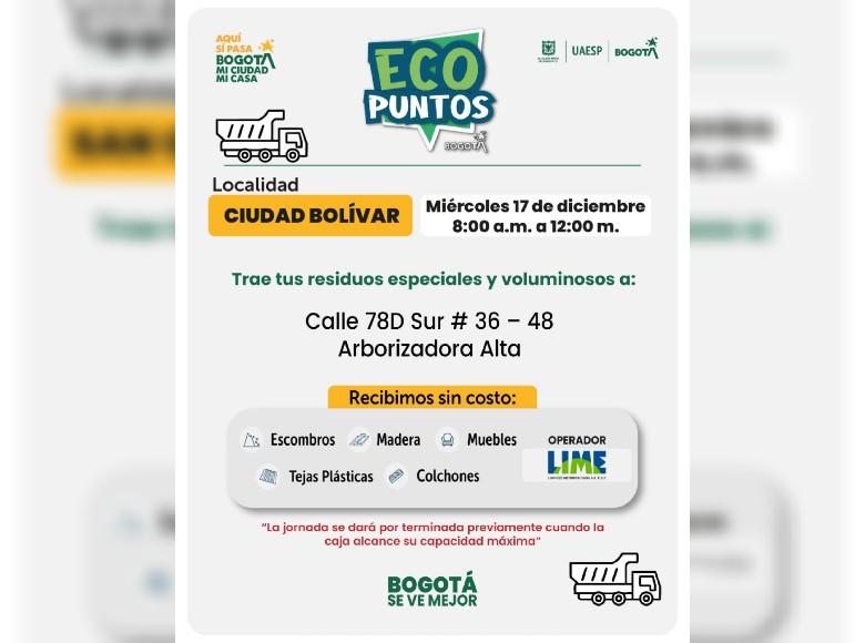 ¡Aquí sí pasa, en Bogotá, mi Ciudad, mi Casa trabajamos para mantener limpia nuestra ciudad! La Unidad Administrativa Especial de Servicios Públicos (UAESP), invita a la ciudadanía que tenga muebles, escombros o enseres en mal estado a llevarlos a los Ecopuntos disponibles en Bogotá que se tendrán ubicados en Puente Aranda, San Cristóbal y más localidades, del 15 al 20 de diciembre de 2025.