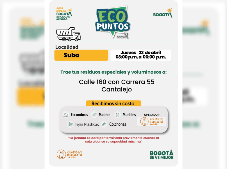 ¡Aquí sí pasa, en Bogotá, mi Ciudad, mi Casa trabajamos para mantener limpia nuestra ciudad! La Unidad Administrativa Especial de Servicios Públicos (UAESP) invita a la ciudadanía que tenga muebles, escombros o enseres en mal estado a llevarlos a los Ecopuntos disponibles en Bogotá que se tendrán ubicados en diversas localidades, del 20 al 25 de abril del 2026.