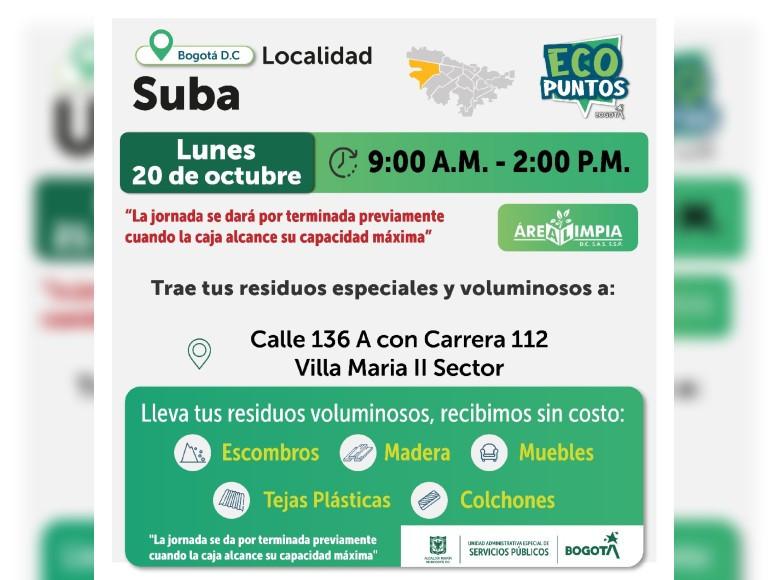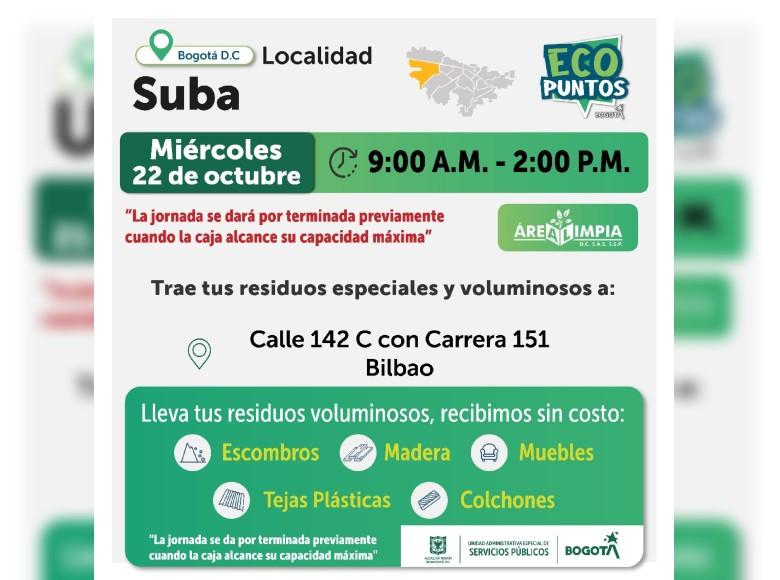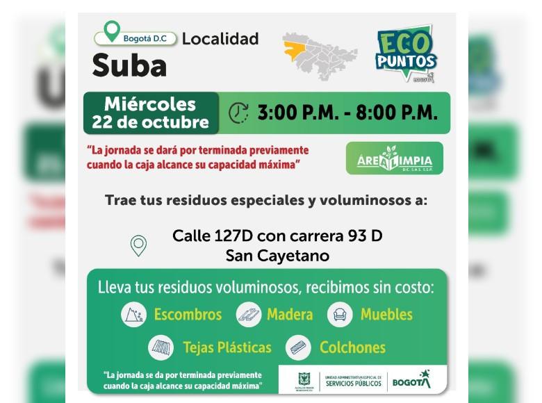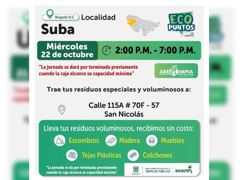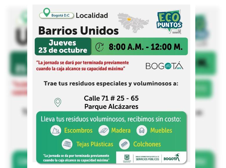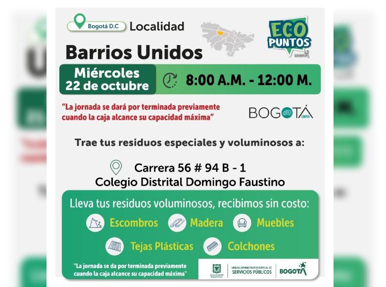 ¡Aquí sí pasa, en Bogotá, mi Ciudad, mi Casa trabajamos para mantener limpia nuestra ciudad! La Unidad Administrativa Especial de Servicios Públicos (UAESP), invita a la ciudadanía que tenga muebles, escombros o enseres en mal estado a llevarlos a los Ecopuntos disponibles en Bogotá que se tendrán ubicados en Suba, Barrios Unidos y más localidades, del 20 al 25 de octubre.