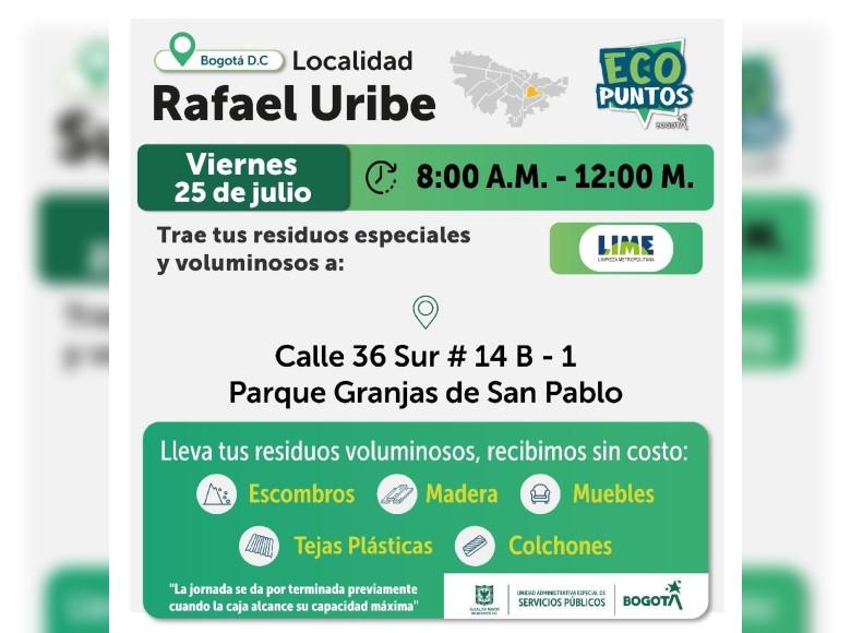 ¡Aquí sí pasa, en Bogotá, mi Ciudad, mi Casa trabajamos para mantener limpia nuestra ciudad! La Unidad Administrativa Especial de Servicios Públicos (UAESP), invita a la ciudadanía que tenga muebles, escombros o enseres en mal estado a llevarlos a los Ecopuntos disponibles en Bogotá que se tendrán ubicados en Puente Aranda, San Cristóbal y más localidades, del 21 al 26 de julio de 2025.