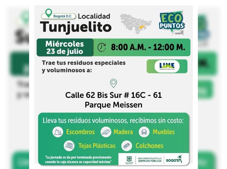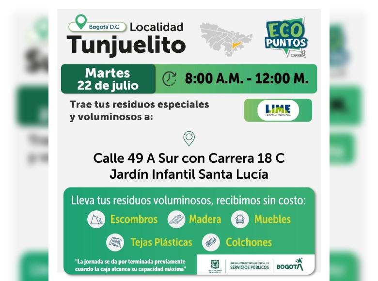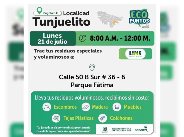 Ten en cuenta que la Unidad Administrativa Especial de Servicios Públicos (UAESP) dispone semanalmente de varios Ecopuntos para prestar este servicio a la ciudadanía en las localidades de Bogotá.